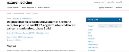 11月4日,国际四大医学期刊之一、英国《自然》旗下《自然医学》(Nature Medicine)在线发表CDK4/6抑制剂达尔西利(SHR6390)联合氟维司群治疗既往内分泌治疗后疾病进展的HR+/HER2-晚期乳腺癌的多中心、随机、双盲III期临床研究(DAWNA-1研究)中期分析结果报告,首次对氟维司群(雌激素受体降解剂)±达尔西利治疗激素受体阳性晚期乳腺癌的有效性和安全性进行了比较。研究结果显示,达尔西利+氟维司群组与安慰剂+氟维司群组相比,无进展生存期(PFS)显著延长。该项研究由中国医学科学院肿瘤医院徐兵河教授担任leading PI,全国39家医院参研,由PG医药临床研发团队支持完成。