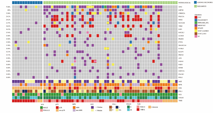 对65例接受手术治疗的患者进行二代测序,KRAS(50%)、TP53(25%)和ARID1B(17%)是肺腺癌中最常见的突变基因;在鳞状细胞癌中,Tp53(85%)和Lrp1B(47%)最常见(图5)。与低肿瘤突变负荷(TMB)的患者相比,高TMB患者具有更好的MPR和pCR倾向性,但差异无统计学意义(P=0.1691和P=0.3847)。