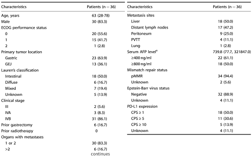 2020年12月4日至2023年8月4日期间,研究共纳入36例患者。其中30例患者(83.3%)为男性。大多数患者临床分期为IVB期(n=31,86.1%)。18例患者(50.0%)伴有肝转移,17例(47.2%)伴有远处淋巴结转移,9例(25.0%)伴有腹膜转移。中位血清AFP水平为739.8ng/ml(范围:77.7-321847.0)。
