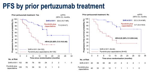 对于既往接受过帕妥珠单抗治疗的患者,瑞康曲妥珠单抗组的中位PFS为30.6个月(95%CI:16.7-NR),吡咯替尼联合卡培他滨组的中位PFS为7.0个月(95%CI:5.6-9.7),HR=0.25(95%CI:0.16-0.40)。对于既往未接受过帕妥珠单抗治疗的患者,瑞康曲妥珠单抗组的中位PFS为33.3个月(95%CI:19.4-NR),吡咯替尼联合卡培他滨组的中位PFS为9.7个月(95%CI:5.4-16.6),HR=0.20(95%CI:0.09-0.44)。