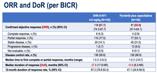瑞康曲妥珠单抗组的客观缓解率(ORR)为81.7%,吡咯替尼联合卡培他滨组的ORR为55.9%。瑞康曲妥珠单抗组的中位缓解持续时间(DoR)为27.8个月(95%CI:17.8-NR),吡咯替尼联合卡培他滨组的中位DoR为10.9个月(95%CI:8.3-NR)。